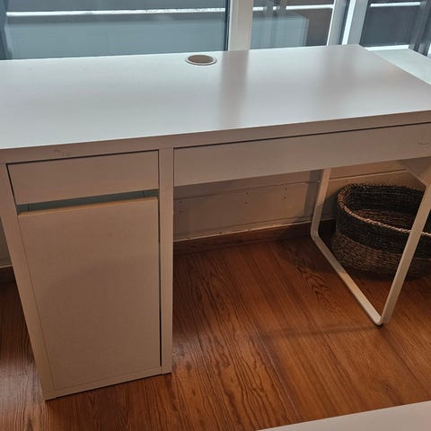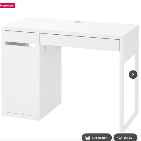 IKEA hjørneskrivebord i hvit farge. Designet for å passe inn i hjørner og optimalisere plass. Passer til bruk på barnerom.