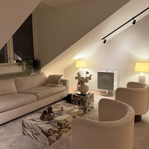 Selger et pent brukt sidebord/sofabord fra Audo Copenhagen. Det grafiske understellet er hvitt og bordplaten er i marmor.