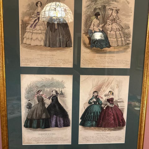 • Opprinnelse: Dette er litografier eller håndkolorerte graveringer fra et populært parisisk motemagasin utgitt på 1800-tallet.