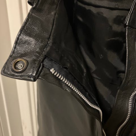 Leather Wau (?) skinnbukser i svart farge, størrelse 38. Trolig en MC bukse da den er laget av veldig tykt skinn. Bukse med glidelås og knapp foran. Designet for dame str 38.