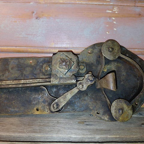 Gammel lås med låsekasse i tre Gammel nøkkel virker, men er ikke original