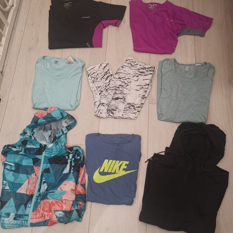 Selges samlet. Mesteparten er Small, men noe XS og M som passer fint til en S/M. Adidas zip (S), Nike singlet (S), Levi's t-skjorte (XS), Nike grønn (M), Kari Traa (M). Varsity (S), Nike rosa (XS), Nike lilla t-skjorte, Calvin Klein t-skjorte (S). Tiger of Sweden sko (37). Vagabond sko (38).