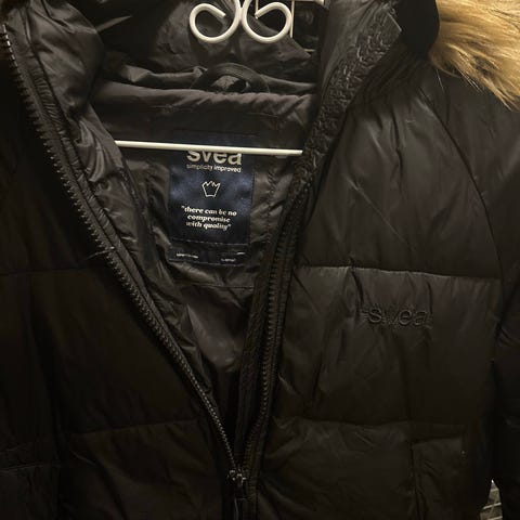 Svea jakke for kvinner/jenter i størrelse XS, svart farge og laget av bomull. Jakken har hette med avtakbar pels og flere lommer. Passer til bruk som yttertøy i kaldere vær.