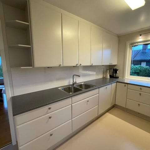 Kjøkkeninnredning hvit med benkeplate og vask