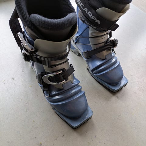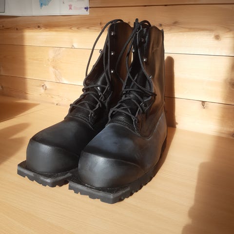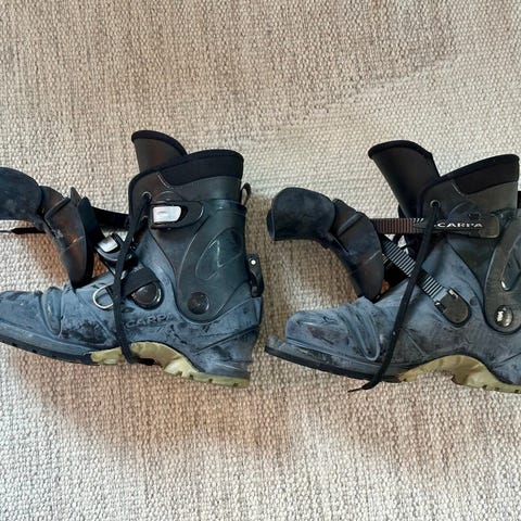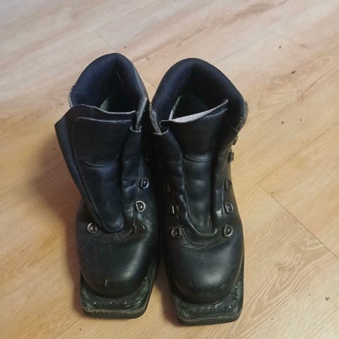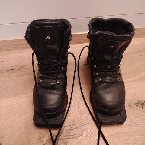 Helstive lærsko til 75 mm binding fra Asolo i str 42, men snøring og plastremmer for ekstra god stramming. Eldre type. Innersåle mangler