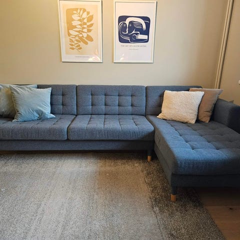 Den har noen små flekker, noen på sitteputene og på armlenet, men de er ikke veldig fremtredende og er ellers i veldig fin stand. Noen av flekkene går nok av i vask også.
