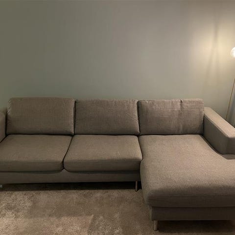 Sofaen kan tas fra hverandre i to deler, så den er enkel å frakte og veier heller ikke et tonn. Den er allerede tatt fra hverandre og er klar til å hentes.