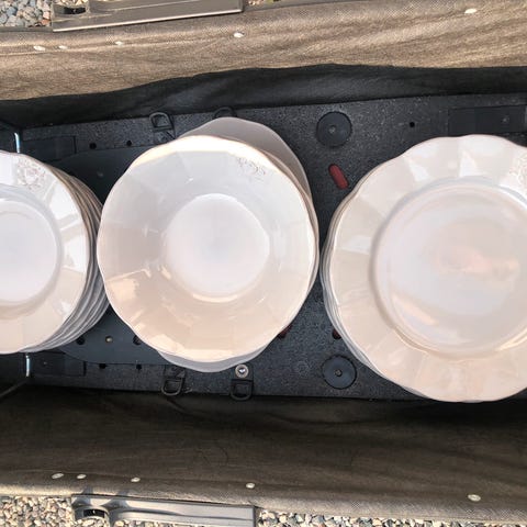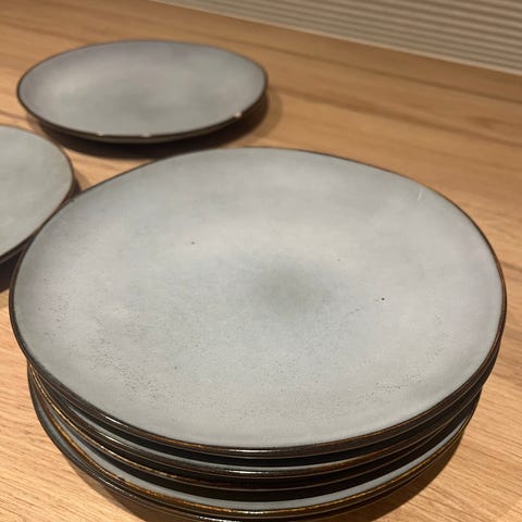 Fransk design fra Arcoroc, med kubisk snitt. 6 tallerkener til frokost eller kake med 3 kaffekopper tilhørende små fat. Utrolig fine i kombinasjon med hvitt servise. Settet er fra 90-tallet og er pent tatt vare på.
