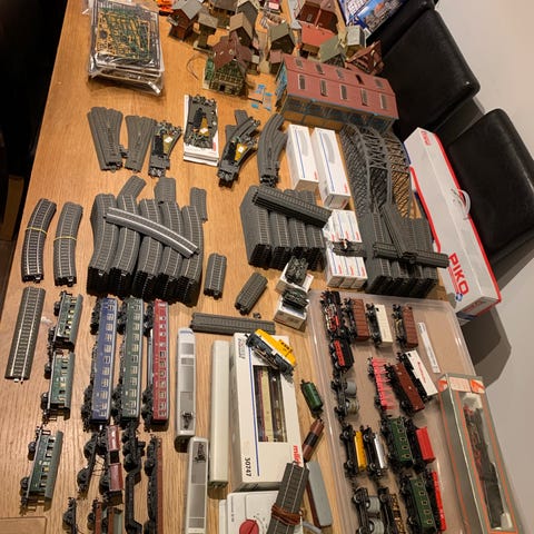 Märklin modelljernbane-sett med flere tog, ulike skinner, koblinger og tilbehør. Eldste deler er fra tidlig 60-tall, nyeste deler er fra (omtrentlig) 2000-2005.