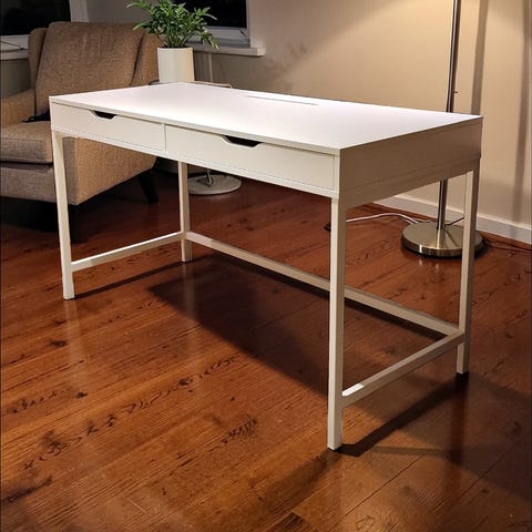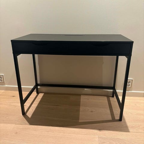 Praktisk skrivebord/pult med oppbevaring og kabelorganisering.