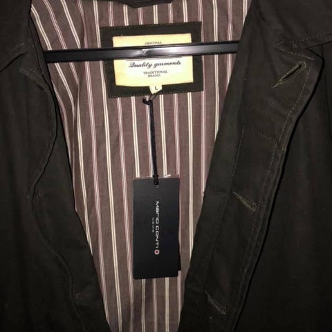 «Saki» Skinn vinterjakke i størrelse L for menn. Jakken er brun og laget av skinnmateriale, egnet for utendørs bruk i vinter.