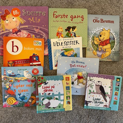 Samling av Ole Brumm barnebøker med ulike historier og illustrasjoner, egnet for små barn. Bøkene har fargerike bilder og enkle tekster som passer for tidlig lesing og høytlesning.