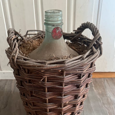 Meget flott 10 liters glass ballong med pen flettet kurv som sitter fast rundt ballongen. Se mål, denne tar ikke stor plass. Kan greit pakkes sikkert og sendes med post nord. Bredde ca 33 cm og høyde va 45 cm, frakt 129,-