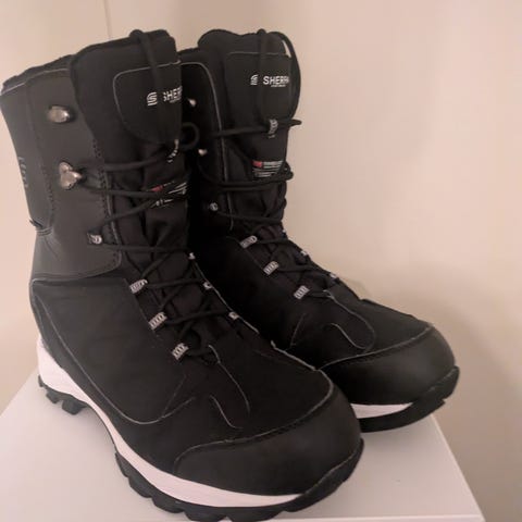Dr. Martens støvler i størrelse 41 (UK size 7). Støvlene er svarte og laget av lær. De har snøring foran og en robust såle med godt grep. Egnet for både hverdagsbruk og mer krevende forhold.