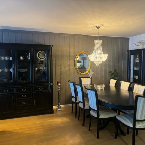 Hvitt spisebord med åtte stoler og vitrineskap i tre