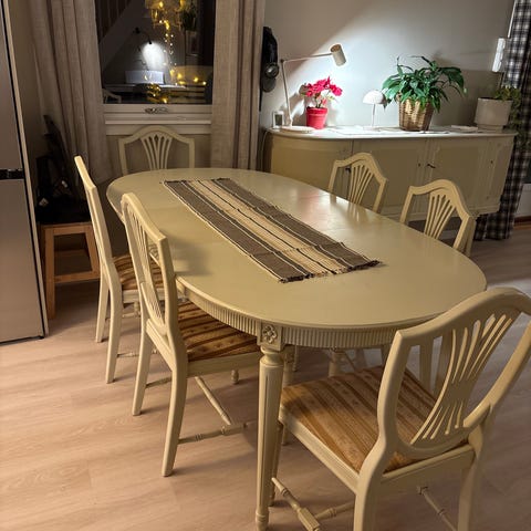 Hvitt spisebord med seks stoler og vitrineskap i tre. Bordet har en forlengelsesfunksjon med plass til flere personer. Stolene har flettet rygg og polstrede seter. Vitrineskapet har glassdører og flere oppbevaringsskuffer og skap nedenfor.
