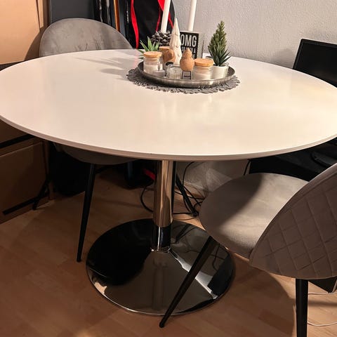 Spisebord med 2 ilegg plater og vitrineskap selges.