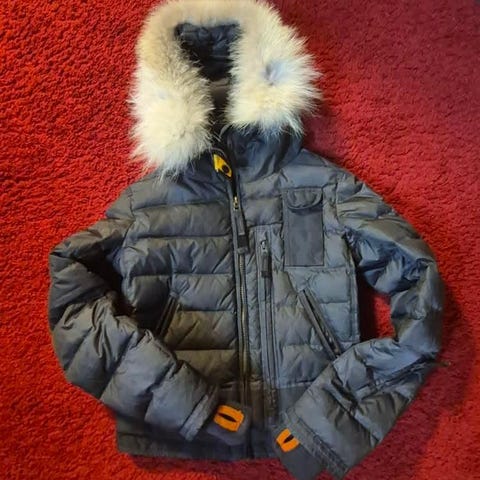 Pent brukt Parajumpers jakke til jenter i fargen mørkeblå. Størrelse young medium. Hetten inkluderer pelsdetaljer, og er laget for å gi varme og beskyttelse i kaldt vær.