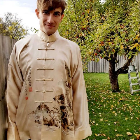 Dette er en kinesisk tradisjonell drakt med drage- og skybroderi, mandarin-krage og knappelukking.