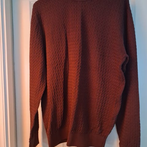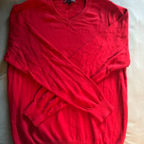 Selger en rød genser fra Dressmann. Den er tynn og litt penere i stilen, med rund hals.