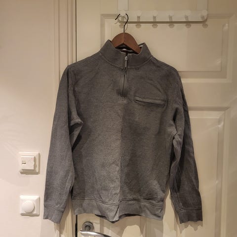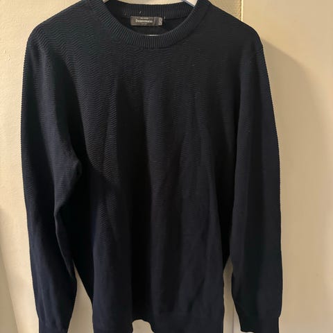 Selger en mørk blå genser fra Dressmann med V-hals. Tynn og litt penere i stilen, fin til både jobb og fritid.