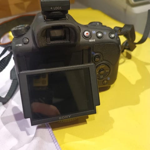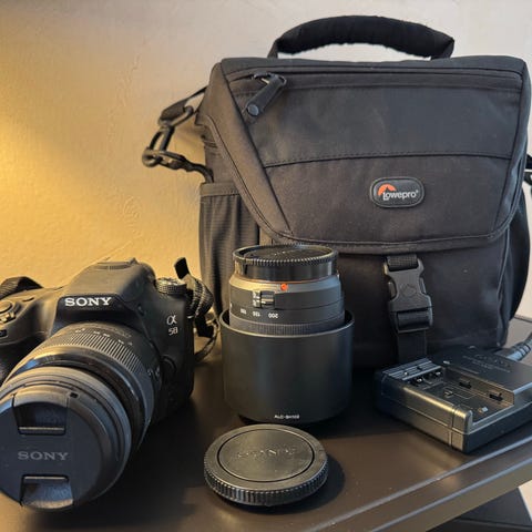 Sony Alpha 58 speilreflekskamera med Sigma 70-300mm objektiv. Kameraet har utskiftbart objektiv og digital skjerm på baksiden. Objektivet har zoomfunksjon fra 70 til 300 mm. Selger også med standard objektiv 18-55mm (burde ha ny linsebeskyttelse). Er solfilter på begge linsene, som også beskytter selve linsen. Kameraet leveres med kameraveske for oppbevaring og transport. Kameravesken er som ny, omtrent ikke brukt. Kameraet og linsene er brukt.