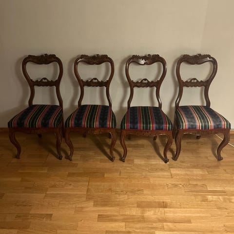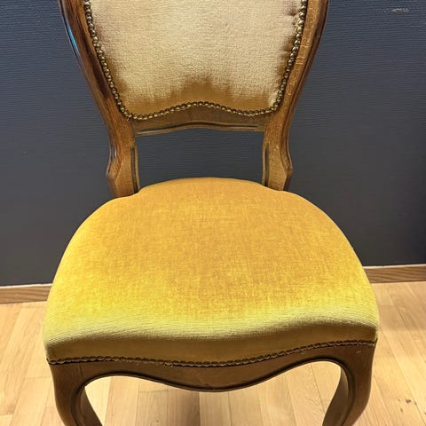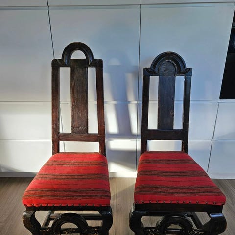 2 spisestue-stoler i beiset eik, trolig ca. 100 år. Trukket om i senere år og lite brukt etter det.