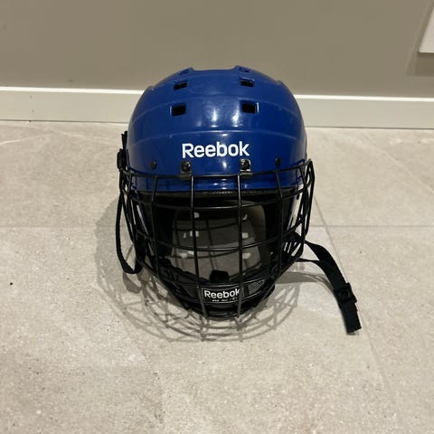 Reebok ishockeyhjelmer for barn i blå farge med ventilasjonshull og justerbar hakestropp. Settet inkluderer fem svarte hockeypucker med Reebok-logo.