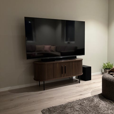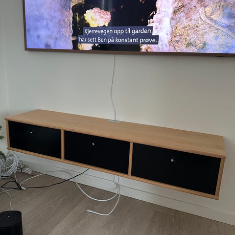 Bolia opus tv-benk. Elegant og tidløs design med stoffdør som lar deg bruke fjernkontrollen gjennom panelet. Skapdøren i midten må skifte hengsler for å fungere. Selges kr 1500 eller HBO