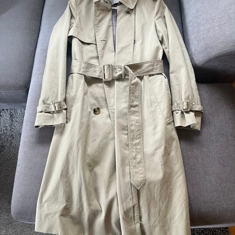 Trenchcoat i str. large, Den er lys grå- beige, ytterstoff 100% bomull og for 100% polyester. Den har dobbelt knapping foran, belte i midjen, lommer og detaljer som skulderklaffer og splitt bak. Kan vaskes i 30 grader. Kåpen har vært brukt et fåtall ganger. Den kan fint brukes for M .