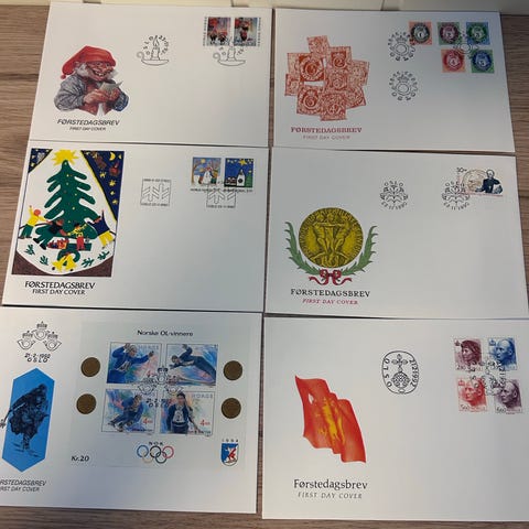 Samling av Norske Førstedagsbrev komplett i mapper fra tidsrommet 1989–2013. Inneholder stemplede frimerker på konvolutt med forskjellige motiver som OL-vinnere, kongelige, julemotiv, kunst og mange andre norske temaer.