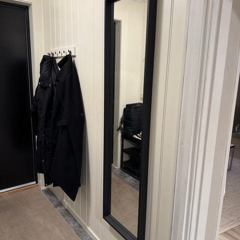 Jysk dekorasjon ornamentspeil med svart ramme. Speilet har en enkel og funksjonell design som kan brukes til dekorasjon og romforbedring.