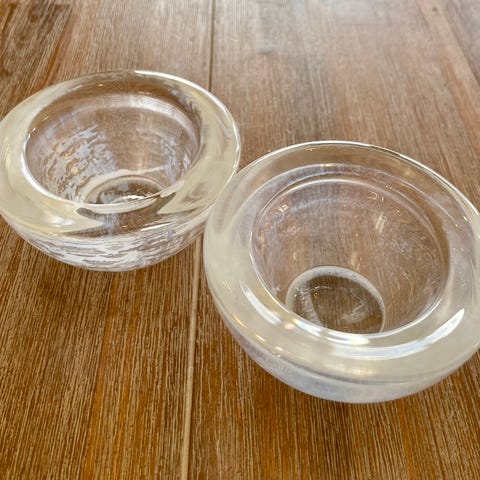 Hadeland Glassverk dekorasjonsornamenter laget av glass. Settet består av tre telysholdere i forskjellige farger, inkludert klart/hvit og lilla glass. Passer til dekorasjon i hjemmet.