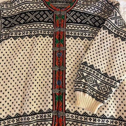Strikket kofte i ull selges for 1000 kroner. Den er Ubrukt. men jeg har vasket den på ullprogram. Uvisst hvilket mønster dette er men, jeg misstenker at det er fristrikk.