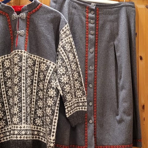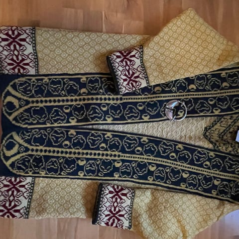Strikket i ribbstrikk med god elastisitet og solid kvalitet, slik man forventer av eldre norsk ullproduksjon.