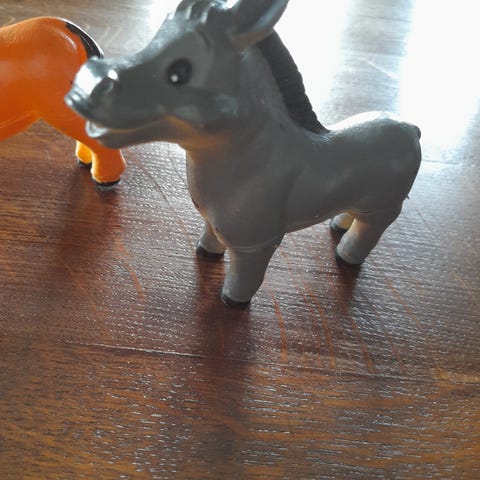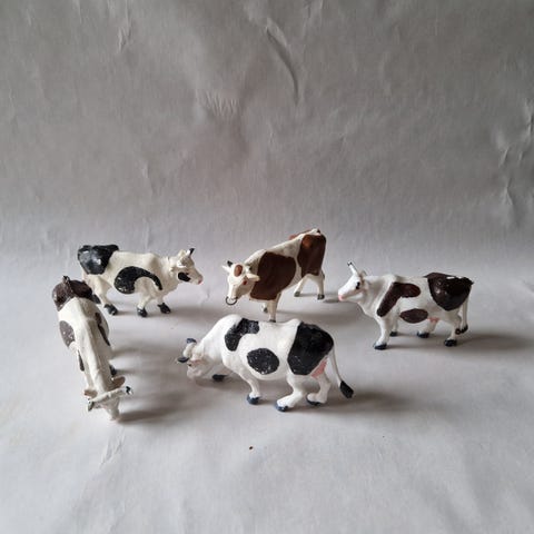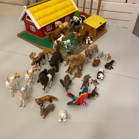 Lekesett med dyrefigur i plast, inkludert kuer, griser, sauer, kyllinger, trær og gjerder. Settet inneholder ulike dyr i forskjellige farger og former, egnet for barn til lek og læring om gårdsliv. Nesten ubrukt.