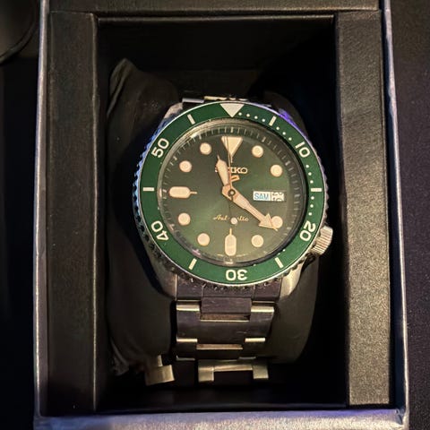 Selger en Seiko 5 Sports GMT Automatic SSK033K1 i pent brukt stand. Meget pen klokke – perfekt for både hverdagsbruk og eventuelt reiser med sin GMT-funksjon.