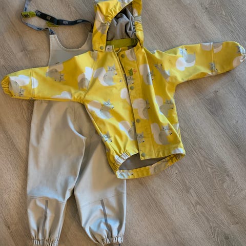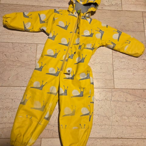 Vinterregndress fra Kattnakken i 104. Godt brukt, men holder barnet tørt. Lappet flere steder med gjennomsiktige lapper. Mangler fotstrikk og en knapp til strikk. Hempen er løs.