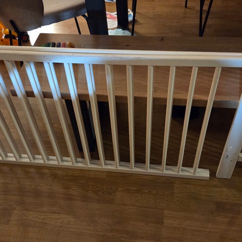 Sprinkelseng barneseng i blå ich farge. Sengen er laget av tre og har sprinkelgitter på sidene. Egnet for små barn. Noen bruksspor og merker på treverket. Inkluderer madrass.