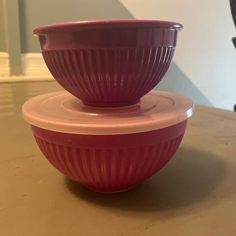 De store er ca 8 cm høye og 12 cm i diameter og rommer ca 6 dl. De små er ca 6 cm høye og 9 cm i diameter og rommer ca 3 dl.