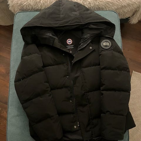 Canada Goose Macmillan Grå jakke med svart logo. Veldig varm perfekt til vintertemperaturer. Lite Riv i armhulen men ikke synelig i det hele tatt. Passer til L og M. L vis du vil ha litt strammere. Åpent for Bud