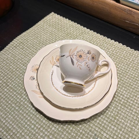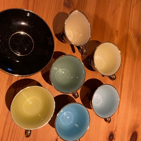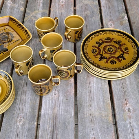 Fint Stavangerflint kaffeservise i svart og gullfarge, meget fin stand, orginale klistrelapper er fremdeles på noen av delene.