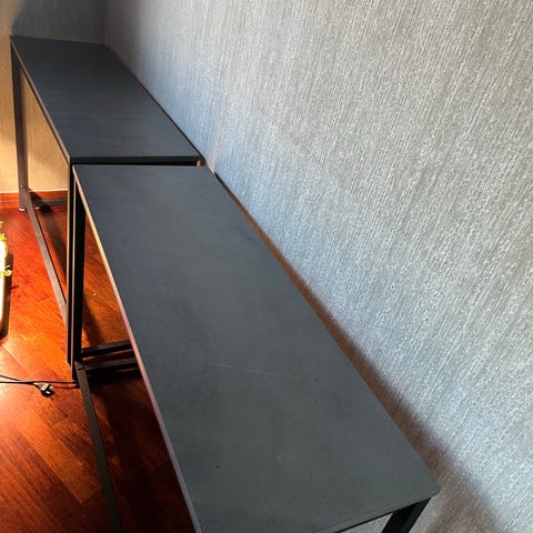 Konsollbord i svart metall med rektangulær form og åpen ramme. Bordplaten har en slank design og bordet har en minimalistisk stil som passer til ulike rom.