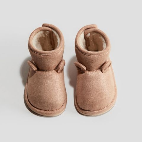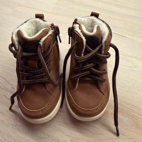 Pent brukt vintersko til baby. Foret med pels, knyting foran og glidelås på siden.