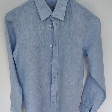 Selger en tilnærmet ubrukt og pen lin skjorte i str. 170 cm. Ermene kan også brettes opp som vist på bilde.