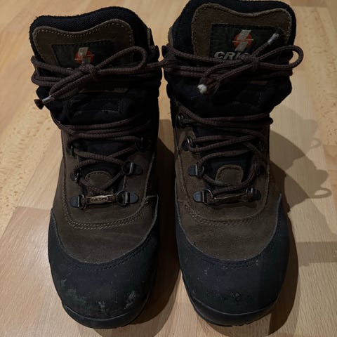 Crispi tursko i størrelse 39. Skoene er laget i rød semsket skinn med sort detaljer. Egnet for fotturer og utendørs bruk, med solide såler for godt grep. Goretex. Varme gode sko, ull i foret, med mye bruk igjen. En liten skade oppe bak på søm på ene skoen som jeg ikke har oppdaget før nå når jeg skulle ta bilder. Tenker den lille glippen enkelt kan limes igjen om ønskelig. Sko snorene er litt frynsete i tuppene, men det har ingen praktisk betydning. Selges for 500kr pluss frakt.