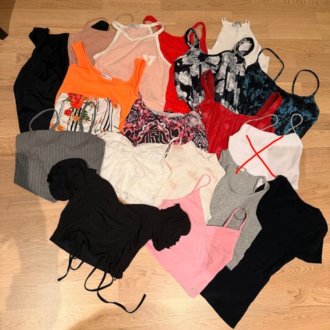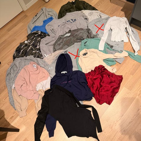 En stor pose med masse klær, sommer klær, pen tøy, jeans, bukser, kjoler, skjorter og gensere. Har 2 second female skjørt oppi som kostet 1899kr pr skjørt, så her får du mye for pengene:-)