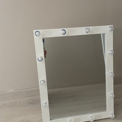 IKEA speil med integrerte lys rundt kanten. Speilet har en hvit ramme og kan plasseres på bord eller henges opp. Lysene er festet med ledning og gir ekstra belysning rundt speilet.