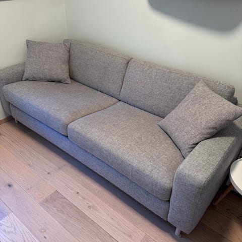 Selger en stor sofa fra Bolia. Den har en innebygget stor dobbeltseng sovesofa, som er enkel og rask å trekke ut (og oppriktig god å sove i!) Senga er på målene 207cm x 163cm når den er utslått.