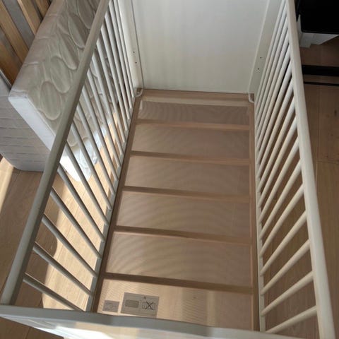 IKEA Sprinkelseng barneseng med hvit finish. Designet for barn med sikkerhetsrekkverk rundt sengen. Egnet for bruk i barnerom. Sengehest følger med.